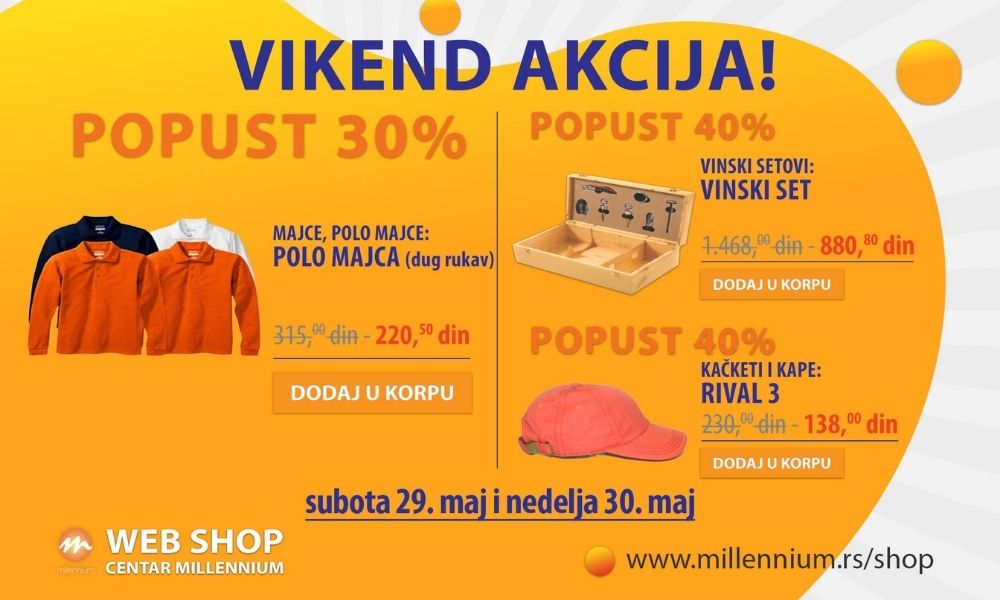 Iskoristite vikend akciju i poručite neki od artikala koji su na popustu. Ovog vikenda polo majce – dug rukav snižene su 30%, dok su kačketi i vinski setovi (svetli) sniženi čak 40%. Akcijske cene važiće u subotu 29. maja i u nedelju 30. maja.