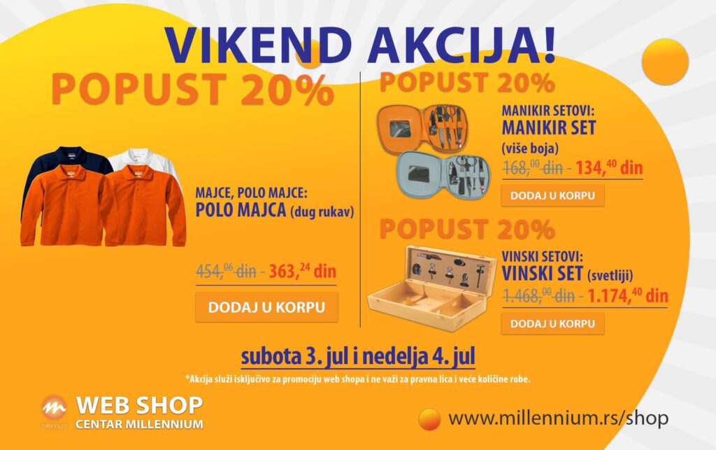 Iskoristite vikend akciju i poručite neki od artikala koji su na popustu. Ovog vikenda sniženi su polo majce – dug rukav, manikir set i vinski set za 20%. Akcija služi isključivo za promociju web shop-a i ne važi za pravna lica i veće količine robe.