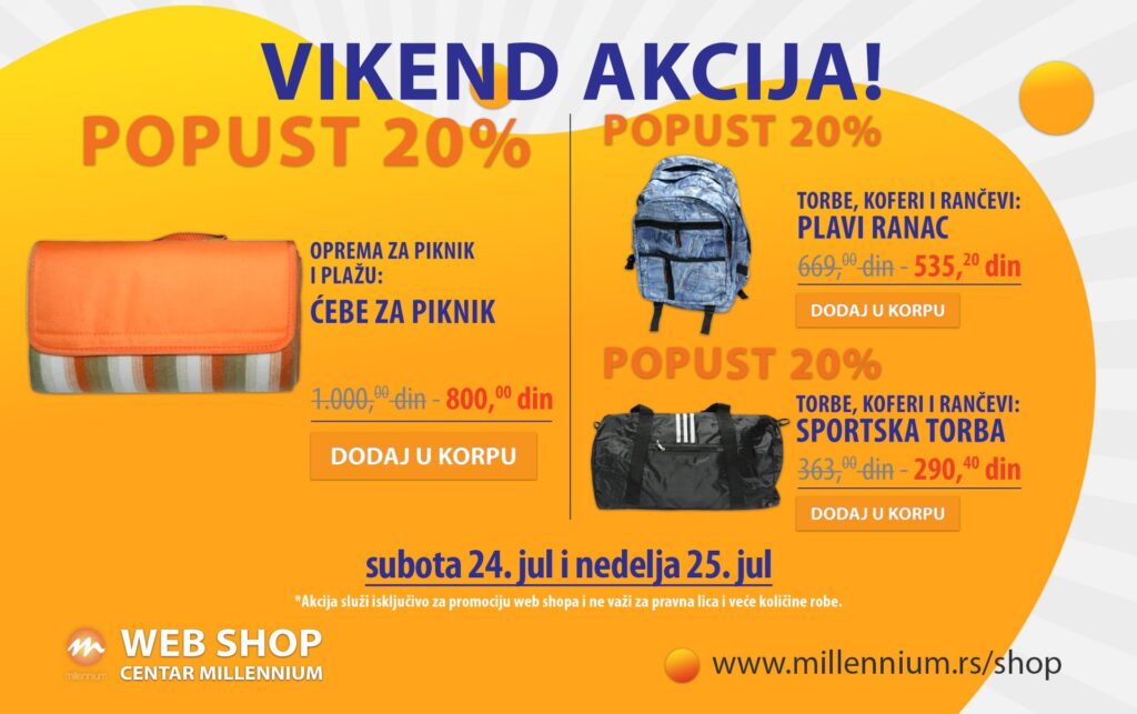 Iskoristite vikend akciju i poručite neki od artikala koji su na popustu. Ovog vikenda sniženi su: ćebe za piknik, ranac i sportska torba za 20%.